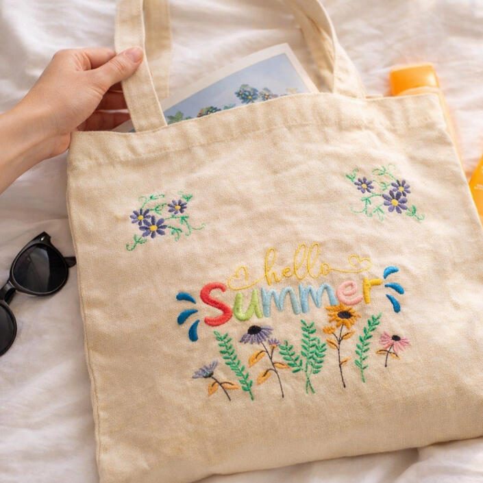 ☀️ Tote bag brodé – esprit étéSac en tissu avec broderie colorée “hello summer”.