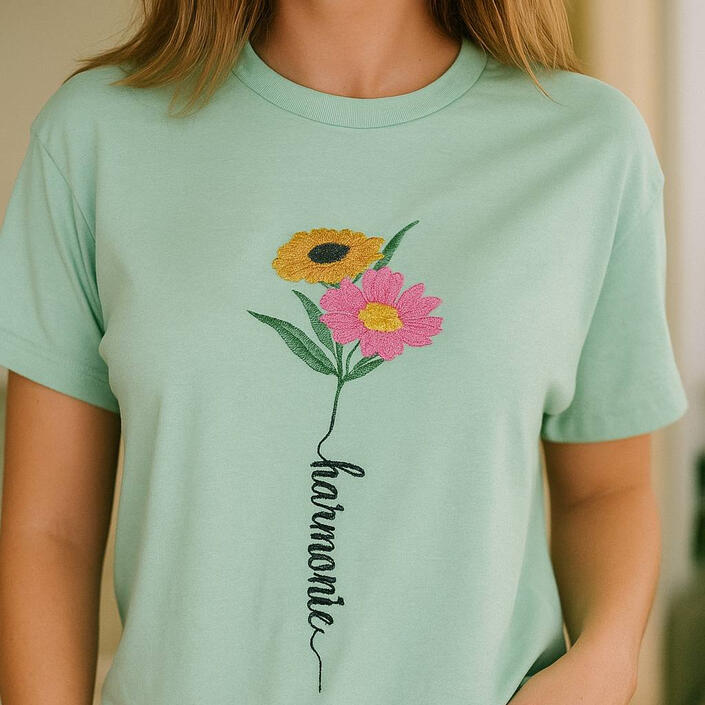 🌸 T-shirt brodé – douceur & éléganceT-shirt avec broderie florale délicate et message “harmonie”.
